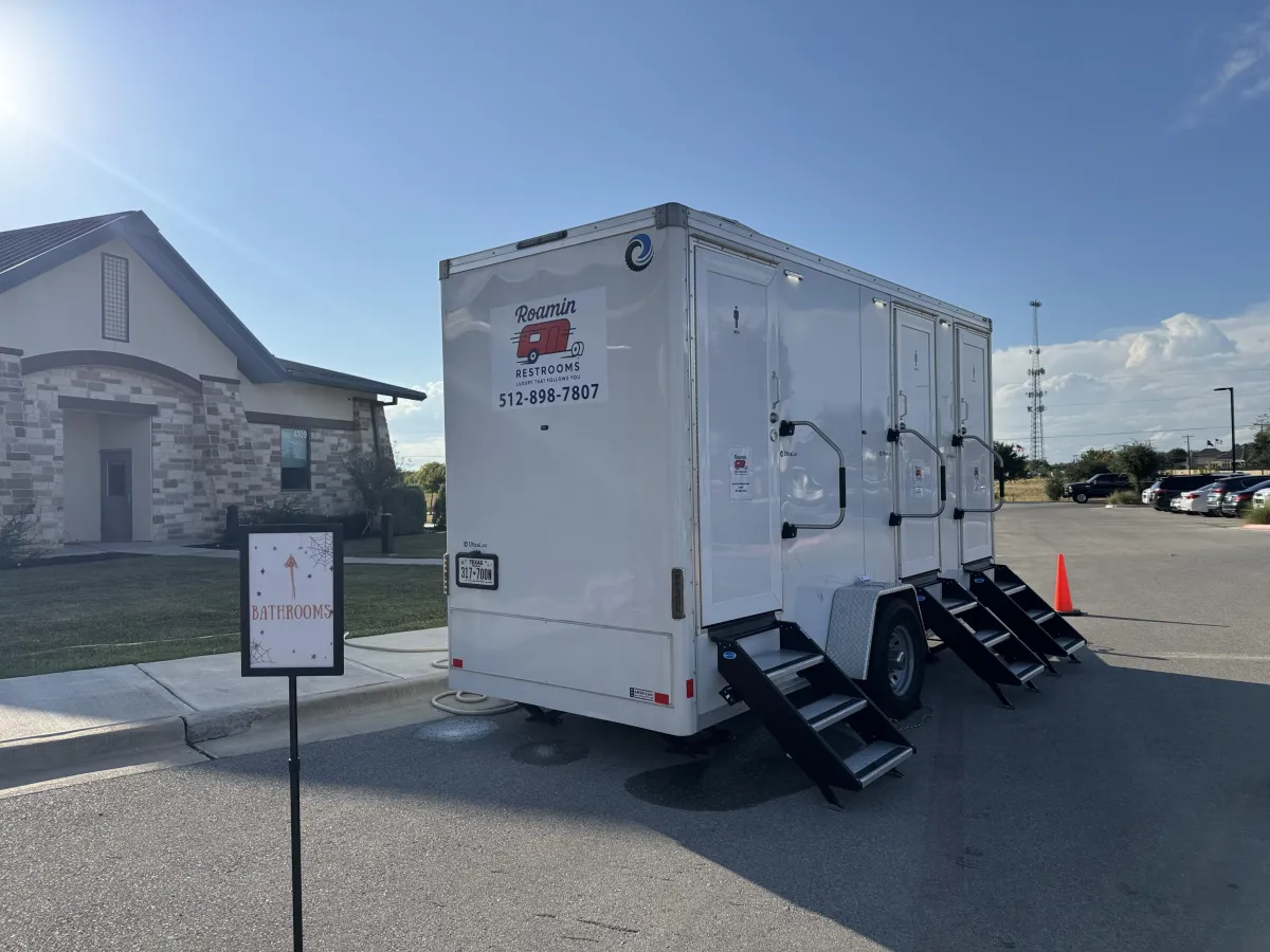 Our luxury rentals include porcelain toilets, running water sinks, climate control (AC/heat), interior lighting, mirrors, and hand soap dispensers. Some models feature wood-style floors, Bluetooth sound, and occupancy indicators.